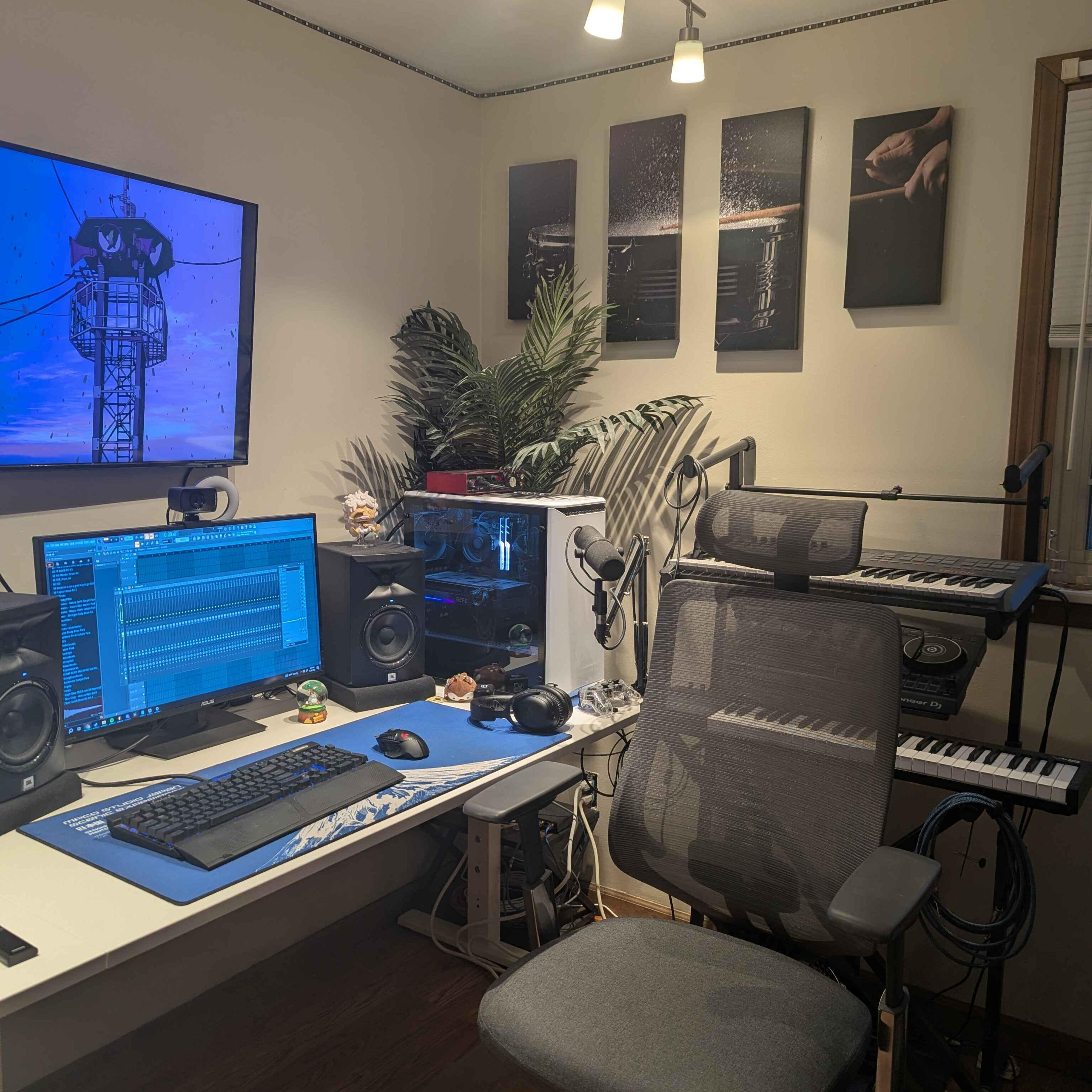 Hey! My name is Beadie and I've been making music since around 2017 but I started taking it more seriously around 2020! I primarily use FL Studio to make my music but I will sometimes use SynthV or Vocaloid software when I want to mess around with vocal synths. I own two electric guitars, an electric drum set, and many other instruments! Here is a picture of the setup I currently use to make all my music!